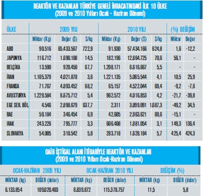 Ülkemiz türbinler, reaktör ve kazanlar ihracatı 2010 yılının Ocak-Haziran döneminde geçtiğimiz yılın eş zamanına göre yüzde 5,8 oranında artış göstermiş durumda. Bu artış neticesinde 2009 yılının Ocak-Haziran döneminde 109 milyon 20 bin dolar olan reaktör ve kazanlar ihracatımız 2010 yılının aynı zaman dilimine gelindiğinde yüzde 5,8 artış ile 115 milyon 378 bin dolar olarak gerçekleşti. Türkiye’nin en fazla reaktör ve kazanlar ihracatı yaptığı ülkenin ise ABD olduğu görülüyor. Bu ülkeye 2009 yılının Ocak-Haziran döneminde 65 milyon 433 bin dolarlık reaktör ve kazanlar ihracatı söz konusu iken 2010 yılının aynı dönemine gelindiğinde bu değer yüzde 12,2 oranında gerileyerek 57 milyon 434 bin dolar oldu. reaktör ve kazanlar mal grubu ihracatımızdaki ikinci en büyük Pazar ise Japonya oldu. Japonya’ya 2009 yılının Ocak-Haziran döneminde 1 milyon 690 bin dolar reaktör ve kazanlar ihracatımız varken 2010 yılının eş dönemine gelindiğinde 12 milyon 864 bin dolarlık ihracat gerçekleşti. Japonya’nın ardından en fazla türbinler, reaktör ve kazanlar ihracatı yaptığımız üçüncü ülke ise Belçika oldu. Söz konusu ülkeye 2009 yılının Ocak-Haziran döneminde 920 bin dolarlık reaktör ve kazanlar ihracatı gerçekleştirilmişken 2010 yılının Ocak-Haziran eş zamanına gelindiğinde ise önemli bir artış ile 6 milyon 616 bin dolar ihracat gerçekleştirildi. Reaktör ve kazanlar ihracatımızda en fazla yükseliş ise Slovakya’da yaşanmış. Slovakya’dan 2009 yılının Ocak-Haziran döneminde 310 bin dolarlık reaktör ve kazanlar ihracatı yapılmışken 2010 yılının aynı dönemine gelindiğinde 1 milyon 328 bin dolarlık ihracat değerine ulaşılarak yüzde 424,3’lük yükseliş yaşanmış. Reaktör ve kazanlar ihracatındaki en fazla ihracat artışının yaşandığı diğer ülkeler ise, Irak ve İran olarak sıralanıyor.