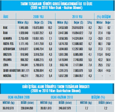 Makine üreten makineler olarak da bilinen takım tezgâhları sektörü 2010 yılının Ocak-Haziran döneminde değer bazında yüzde 7,2 oranında artış göstererek bir önceki yılın aynı döneminde 230 milyon 84 bin dolar olan sektör ihracatımız 2010 yılının Ocak-Haziran döneminde 246 milyon 687 bin dolar seviyesine yükseldi. Takım tezgâhları ihracatımızın en fazla olduğu ülkeler incelendiğinde ise Irak’ın birinci sırada yer aldığı görülüyor. Söz konusu ülkeye 2009 yılının Ocak-Haziran döneminde 19 milyon 873 bin dolarlık takım tezgâhları ihracatı yapılmışken 2010 yılının Ocak-Haziran zaman diliminde ise yüzde 0,7 artış ile 20 milyon 18 bin dolarlık ihracat yapılmış. Takım tezgâhları ihracatımızın en büyük ikinci pazarı ise İran olmuş. İran’a 2009 yılının Ocak-Haziran döneminde 15 milyon 937 bin dolarlık takım tezgâhları ihracatı gerçekleştirilmişken 2010 yılının Ocak-Haziran döneminde ise bu değer yüzde 19,6 oranında artarak 19 milyon 54 bin dolara ulaştı. Almanya ise takım tezgâhları ihracatımızın en büyük üçüncü pazarı konumunda. Almanya’ya 2009 yılının Ocak-Haziran döneminde 19 milyon 651 bin dolarlık takım tezgâhları ihracatı yapılmışken 2010 yılının Ocak-Haziran döneminde ise bu değer yüzde 27,1 oranında gerileyerek 14 milyon 324 bin dolar oldu. Almanya’nın ardından takım tezgâhları ihracatımızın en fazla yapıldığı dördüncü pazarın ise Rusya Federasyonu olduğu görülüyor. Söz konusu ülkeye 2009 yılının Ocak-Haziran döneminde 7 milyon 441 bin dolarlık takım tezgâhları ihracatı yapılmışken 2010 yılının Ocak-Haziran döneminde ise bu değer yüzde 70 oranında artış göstererek 12 milyon 600 bin dolar oldu. Azerbaycan ise takım tezgâhları ihracatımızın en büyük beşinci pazarı konumunda. Azerbaycan’a 2009 yılının Ocak-Haziran döneminde 6 milyon 940 bin dolarlık takım tezgâhları ihracatı gerçekleştiren 2010 yılının eş zaman dilimine gelindiğinde bu değer yüzde 77,2 oranında artarak 12 milyon 297 bin dolar oldu. Azerbaycan’ı ise yüzde 104,3 oranındaki artışla Brezilya takip ediyor. Söz konusu ülkeye 2009 yılının Ocak-Haziran döneminde 3 milyon 918 bin dolar takım tezgâhları ihracatı gerçekleştirilirken, 2010 yılının aynı döneminde bu rakam 8 milyon 5 bin dolar seviyesine çıktı. Brezilya ilk on ülke arasında, yüzde 104,3’lük oranla ülke bazında en fazla ihracat artışının yaşandığı ülke oldu. En fazla ihracatın yaşandığı ülkeler sıralamasında Brezilya’yı takip eden ülke ise Polonya. Söz konusu ülkeye 2009 yılının Ocak-Haziran döneminde 4 milyon 886 bin dolar takım tezgâhları ihracatı gerçekleştirilirken, 2010 yılının aynı döneminde bu rakam 7 milyon 740 bin dolar seviyesine çıktı.