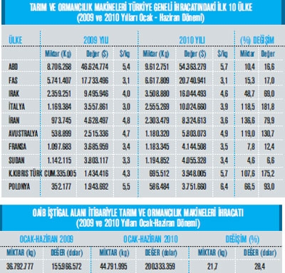 28,4 oranında yükselme göstererek, bu mal grubunda geçtiğimiz yıl 155 milyon 966 bin dolar olan ihracat düzeyi 200 milyon 333 bin dolara çıktı. Tarım ve ormancılık makinelerinde en çok ihracat gerçekleştirdiğimiz ülkenin ise ABD olduğu görülüyor. Söz konusu ülkeye 2009 yılının Ocak-Haziran döneminde 46 milyon 624 bin dolarlık tarım ve ormancılık makineleri ihracatı söz konusu iken 2010 yılının aynı dönemine gelindiğinde bu değer yüzde 16,6 oranında artış kaydederek 54 milyon 363 bin dolar olmuş. 2010 Ocak-Haziran döneminde tarım ve ormancılık makineleri ihracatımızda ikinci en büyük pazarının ise Fas olduğu görülüyor. Fas’a gerçekleştirdiğimiz tarım ve ormancılık makineleri ihracatımız 2009 yılının Ocak-Haziran döneminde 17 milyon 733 bin dolar iken yüzde 17 oranında tartışla bu değer 20 milyon 740 bin dolara yükseldi. Tarım ve ormancılık makineleri ihracatımızdaki üçüncü en büyük pazarının ise Irak olduğu görülüyor. Söz konusu ülkeye 2009 yılının Ocak-Haziran döneminde 9 milyon 495 bin dolar tarım ve ormancılık makineleri ihracatı yapılmışken 2010 yılının aynı döneminde yüzde 69’luk yükselişle 16 milyon 44 bin dolarlık tarım ve ormancılık makineleri ihracatı yapıldı. Tarım ve ormancılık makineleri ihracatımızda gerileme gösteren ülke olmadı. İtalya ise tarım ve ormancılık makineleri ihracatımızın en fazla olduğu dördüncü ülke konumunda. İtalya’ya 2009 yılının Ocak-Haziran döneminde 3 milyon 557 bin dolarlık tarım ve ormancılık makineleri ihracatı yapan firmalarımız 2010 yılının aynı zaman dilimine gelindiğinde 10 milyon 24 bin dolarlık tarım ve ormancılık makineleri ihracatı yapmayı başardılar. İran ise tarım ve ormancılık makineleri ihracatımızın en fazla olduğu beşinci ülke konumunda. İran’a 2009 yılının Ocak-Haziran döneminde 4 milyon 628 bin dolarlık tarım ve ormancılık makineleri ihracatı yapan firmalarımız 2010 yılının aynı zaman dilimine gelindiğinde 8 milyon 324 bin dolarlık tarım ve ormancılık makineleri ihracatı yapmayı başardılar. Yüzde 175,2’lük artışla Kuzey Kıbrıs Türk Cumhuriyeti en fazla ihracat artışı yaşanan ülke oldu. Söz konusu ülkeye 2009 yılının Ocak-Haziran döneminde 1 milyon 434 bin dolar tarım ve ormancılık makineleri ihracatı yapılmışken 2010 yılının aynı döneminde yüzde 175,2’lik yükselişle 3 milyon 948 bin dolarlık tarım ve ormancılık makineleri ihracatı yapıldı.