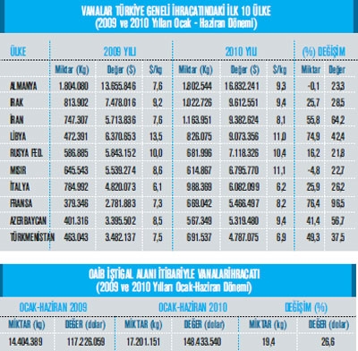 Ülkemiz vana ihracatı 2010 yılının Ocak-Haziran döneminde 26,6 oranında yükseliş göstermiş durumda. Söz konusu mal grubunda 2009 yılının Ocak-Haziran dönemindeki ihracatımız 117 milyon 226 bin dolar iken yüzde 26,6 oranında artış yaşanarak 143 milyon 433 bin dolar seviyesine çıktı. 2010 yılı Ocak-Haziran döneminde en fazla vana ihracatı gerçekleştirdiğimiz ülke ise Almanya oldu. Almanya’ya 2009 yılının Ocak-Haziran döneminde 13 milyon 655 bin dolarlık vana ihracatımız söz konusu iken 2010 yılının aynı döneminde ise yüzde 23,3 yükselme ile söz konusu mal grubundaki ihracatımız 16 milyon 832 bin dolar olarak gerçekleşti. Vana ihracatımızın en büyük ikinci pazarının ise Irak olduğu görülüyor. Bu ülkeye 2009 yılının Ocak-Haziran döneminde 7 milyon 478 bin dolarlık vana ihracatı yapılmışken 2010 yılının Ocak-Haziran döneminde ise yüzde 28,5 oranında ilerleme kaydedilerek 9 milyon 612 bin dolar seviyesine ulaşıldı. Irak’ın ardından bu mal grubu içerisinde en fazla ihracat gerçekleştirdiğimiz üçüncü pazar İran oldu. Bu ülkeye 2009 yılının Ocak-Haziran döneminde 5 milyon 713 bin dolarlık vana ihracatı gerçekleştirilmişken yüzde 64,2 artışla 9 milyon 382 bin dolar düzeyine ulaşıldı. Vana ihracatımızın en hızlı şekilde artış gösterdiği ülke Fransa olmuş. Fransa’ya 2009 yılının Ocak-Haziran döneminde 2 milyon 781 bin dolarlık vana ihracatı yapılmışken, 2010 yılının aynı döneminde bu değer yüzde 96,5 oranında artarak 5 milyon 466 bin dolar oldu.