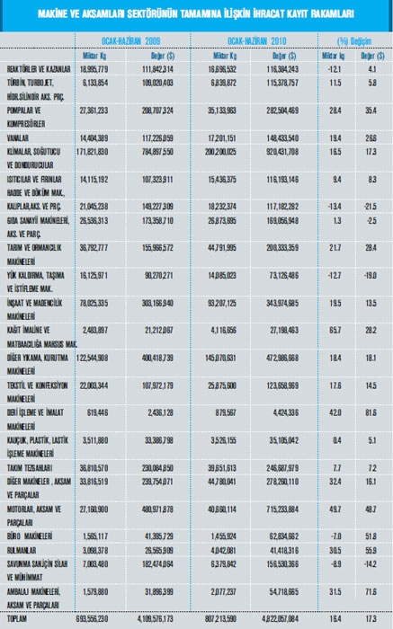 MAKİNE SEKTÖRÜ TOPLAMI 84. FASLIN TAMAMI VE 84. FASIL DIŞI ORTA ANADOLU MAKİNE VE AKSAMLARI İHRACATÇILARI BİRLİĞİ İŞTİGAL ALANI TOPLAMINDAN OLUŞAN MAKİNE SEKTÖRÜNÜN TAMAMININ İHRACATI 2009 YILI OCAK-HAZİRAN DÖNEMİNDE 4 MİLYAR 190 MİLYON DOLAR İKEN, BU RAKAM 2010 YILI AYNI DÖNEMİNDE YÜZDE 17,3 ORANINDA ARTARAK 4 MİLYAR 822 MİLYON DOLARA YÜKSELDİ.