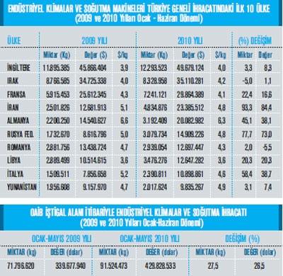 Makine ve aksamları ihracatımızın en önemli kalemlerinden biri olan endüstriyel klimalar ve soğutma makineleri ihracatımız 2010 yılının Ocak-Haziran döneminde geçtiğimiz yılın aynı zaman dilimine göre yüzde 26,5 oranında yükselerek 339 milyon 677 bin dolardan 429 milyon 828 bin dolara ulaştı. Endüstriyel klimalar ve soğutma makineleri ihracatımız, miktar bazında ise yüzde 27,5 oranında yükselme gösterdi. Endüstriyel klimalar ve soğutma makineleri ihracatımızın en fazla olduğu ülke ise İngiltere. Söz konusu ülkeye 2010 yılının Ocak-Haziran döneminde 49 milyon 679 bin dolarlık endüstriyel klimalar ve soğutma makineleri ihracatı gerçekleştirildi. Bu mal grubu içerisindeki en büyük ikinci ihracat pazarımızın ise Irak olduğu görülüyor. Irak’a 2009 yılının Ocak-Haziran döneminde 34 milyon 725 bin dolarlık endüstriyel klimalar ve soğutma makineleri ihracatımız söz konusu iken 2010 yılının aynı dönemine gelindiğinde ise bu değer yüzde 1,1 oranında artış kaydederek 35 milyon 110 bin dolar ihracat düzeyi yakalandı. Endüstriyel klimalar ve soğutma makineleri ihracatımızın üçüncü en büyük ihracat pazarı ise Fransa oldu. Fransa’ya 2010 yılının Ocak-Haziran döneminde 29 milyon 864 bin dolarlık endüstriyel klimalar ve soğutma makineleri ihracatı yapıldı. Endüstriyel klimalar ve soğutma makineleri ihracatımızda Fransa’yı 84,4’lük önemli bir artışla İran takip ediyor. İran’a 2009 yılının Ocak-Haziran döneminde 12 milyon 681 bin dolarlık endüstriyel klimalar ve soğutma makineleri ihracatımız söz konusu iken 2010 yılının aynı dönemine gelindiğinde ise bu değer yüzde 84,4 oranında artış kaydederek 23 milyon 385 bin dolar ihracat düzeyi yakalandı. Endüstriyel klimalar ve soğutma makineleri ihracatımızda bir diğer önemli değer artışı da Rusya Federasyonu ile yaşandı. Söz konusu ülkeye 2009 yılının Ocak-Haziran döneminde 8 milyon 616 bin dolarlık endüstriyel klimalar ve soğutma makineleri ihracatımız söz konusu iken 2010 yılının aynı dönemine gelindiğinde ise bu değer yüzde 73 oranında artış kaydederek 14 milyon 909 bin dolar ihracat düzeyi yakalandı. Endüstriyel klimalar ve soğutma makineleri ihracatımızın 2010 yılı Ocak-Haziran döneminde en fazla artış gösterdiği ülkenin ise İran olduğu görülüyor. Endüstriyel klimalar ve soğutma makineleri ihracatımızda ilk on ülke arasında tek düşüş yaşanan ülke ise Romanya oldu. Romanya’ya 2009 yılının Ocak-Haziran döneminde 13 milyon 438 bin dolarlık endüstriyel klimalar ve soğutma makineleri ihracatımız söz konusu iken 2010 yılının aynı dönemine gelindiğinde ise bu değer yüzde 5,5 oranında düşüş kaydederek 12 milyon 687 bin dolar ihracat düzeyine geriledi.