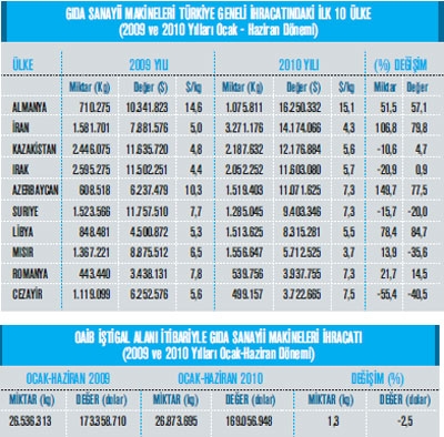 Gıda sanayii makineleri ihracatı Ocak-Haziran 2010 ihracat döneminde bir önceki yıla göre değer bazında yüzde 2,5 oranında gerileme göstererek 173 milyon 358 bin dolar seviyesinden 169 milyon 56 bin dolar düzeyine geriledi. Gıda Sanayii makineleri ihracatımız ülkeler bazında incelendiğinde ise Almanya’nın birinci sırada yer aldığı görülüyor. Söz konusu ülkeye 2009 yılının Ocak-Haziran döneminde 10 milyon 341 bin dolarlık gıda sanayi makineleri ihracatı gerçekleştirilmişken 2010 yılının aynı dönemine gelindiğinde ise bu değer yüzde 57,1 oranında yükseliş kaydederek 16 milyon 250 bin dolar düzeyini yakaladı. Gıda sanayi makineleri ihracatımızın en fazla olduğu ikinci ülke ise İran. Bu ülkeye 2009’un Ocak-Haziran döneminde yapılan gıda sanayii makineleri ihracatı geçtiğimiz yılın Ocak-Haziran dönemine göre yüzde 79,8 oranında artış göstererek 7 milyon 881 bin dolardan 14 milyon 174 bin dolar seviyesine ulaştı. Gıda sanayi makineleri ihracatımızın üçüncü en büyük pazarının ise Kazakistan olduğu görülüyor. Kazakistan’a 2009 yılının Ocak-Haziran döneminde 11 milyon 635 bin dolarlık gıda sanayii makineleri ihracatımız söz konusu iken 2010’un Ocak-Haziran döneminde ise yüzde 4,7 oranında artışla 12 milyon 176 bin dolarlık ihracat gerçekleştirildi. Gıda sanayii makineleri ihracatımızın en fazla artış gösterdiği ülke ise Libya. Bu ülkeye ihracatımız yüzde 84.7 oranında artış gösterdi. Libya’ya 2009’un Ocak-Haziran döneminde yapılan gıda sanayi makineleri ihracatı geçtiğimiz yılın Ocak-Haziran dönemine göre 4 milyon 500 bin dolarken 2010’un Ocak-Haziran döneminde ise bu rakam 8 milyon 315 bin dolarlık ihracat değerine ulaştı. Cezayir ise en fazla ihracat düşüşü yaşanan ülke oldu. Söz konusu ülkeye 2009’un Ocak-Haziran döneminde yapılan gıda sanayi makineleri ihracatı geçtiğimiz yılın Ocak-Haziran dönemine göre yüzde 40,5 oranında düşüş göstererek 6 milyon 252 bin dolardan 3 milyon 722 bin dolar seviyesine ulaştı. Cezayir’den sonra diğer önemli ihracat düşüşü yaşanan ülke ise Mısır oldu. Söz konusu ülkeye 2009’un Ocak-Haziran döneminde yapılan gıda sanayii makineleri ihracatı geçtiğimiz yılın Ocak-Haziran dönemine göre yüzde 35,6 oranında düşüş göstererek 8 milyon 875 bin dolardan 5 milyon 712 bin dolar seviyesine ulaştı.