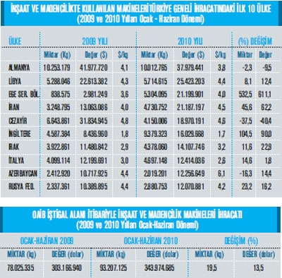 Türkiye inşaat ve madencilik makineleri ihracatı geçtiğimiz yılın Ocak-Haziran dönemine göre 2010 yılının aynı zaman dilimi ile kıyaslandığında yüzde 13,5 oranında değer kazanmış durumda. 2009 yılının ilk 6 ayında 303 milyon 166 bin dolar olan inşaat ve madencilik makineleri ihracatımız 2010 yılının ilk 6 ayında ise 343 milyon 974 bin dolar olmuş. İnşaat ve madencilik makineleri ihracatımız ülkeler bazında incelendiğinde ise Almanya’nın en fazla ihracat gerçekleştirdiğimiz ülke olduğu görülüyor. Söz konusu ülkeye 2009 yılının Ocak-haziran ayları arasında 37 milyon 979 bin dolarlık inşaat ve madencilik makineleri ihracatı yapılmış. Almanya’nın ardından en fazla inşaat ve madencilik makineleri ihracatımız olan ikinci ülke ise Libya. Bu ülkeye geçtiğimiz yılın ilk altı aylık döneminde 22 milyon 613 bin dolarlık inşaat ve madencilik makineleri ihracatı söz konusu iken 2010 yılının aynı dönemine gelindiğinde yüzde 12,4 oranında değer artışı yakalanarak 25 milyon 423 bin dolarlık ihracat yapılmış. Ege Serbest Bölgesi ise inşaat ve madencilik makineleri ihracatımızın en fazla olduğu üçüncü pazar konumunda. Ege Serbest Bölgesi’ne geçtiğimiz yılın ilk 6 aylık döneminde 2 milyon 291 bin dolarlık inşaat ve madencilik makineleri ihracatı gerçekleştirilmişken 2010 yılının aynı dönemine gelindiğinde ise yüzde 611,1 oranında değer artışı ile 21 milyon 199 bin dolarlık ihracat kaydedilmiş. İnşaat ve madencilik makineleri ihracatımız, ülkeler bazında, ihracat artış hızı oranlarına göre değerlendirildiğinde ise Ege Serbest Bölgesi’nin yüzde 611,1 oranında artış ile ilk sırada yer aldığı görülüyor. Diğer önemli artışın ise İngiltere ile yaşandığı görülüyor. Söz konusu ülkeye 2009 yılının Ocak-Haziran döneminde 8 milyon 436 bin dolar olan ihracat, 2010’un aynı döneminde ise yüzde 90 oranında artış göstererek 16 milyon 29 bin dolar ihracat rakamına ulaştı.