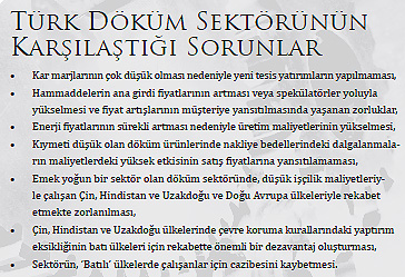 Türk Döküm Sektörünün başlıca sıkıntılarına baktığımızda, satışların yurt dışı ağırlıklı olması ve özellikle parça satışlarının euro ve dolar ile gerçekleştirilmesi buna karşın TL’nin değer kazanması ve yurtiçinde yıllık enflasyon nedeniyle, zaten çok düşük olan kar marjlarının erimesi hatta sıfırlanması sorunu ile karşılaşılmaktadır. Diğer içi pazarımızda ürünlerini herhangi bir bir konu ise global rekabette rakibimiz gümrük ödemeksizin satarken, Türk olan Hindistan gibi ülkeler bizim yurt dökümcüsü Hindistan’a ihracat yaptığın­da yüzde 27’ye varan oranlarda gümrük vergisi ödemekte ve haksız rekabet­le karşı karşıya kalmaktadır.