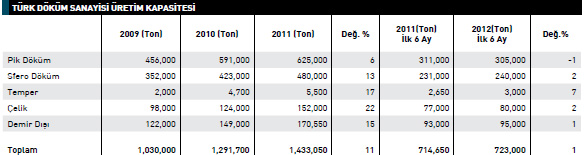 Türkiye’deki değişik yapıdaki döküm iş­letmeleri, 2011 yılında ortalama yüzde 78 kapasiteyle faaliyet gösterdi. Kapa­site kullanımı; demir döküm sanayinde yüzde 80, çelik dökümde yüzde 65, demir dışında ise yine yüzde 80 olarak gerçekleşti. 2011 yılında Türk döküm sektöründe toplam 2,58 milyar euro değerinde, 1 milyon 433 bin ton üretim yapıldı. Çimento ve altyapı sanayide aşınma parçaları üretmekte olan çelik dökümhanelerinin çoğunluğu, büyük çelik parça (15 ton ve üstü) dökümü konusunda uzmanlaştı. Alüminyum döküm temel olarak yüksek basınç ve alçak basınç olmak üzere ikiye ayrı­lır. Yüksek basınçlı döküm yatırımları yüksek kapasiteli tesisler tarafından gerçekleştirilmektedir. Bu tesisler ağırlıklı olarak otomotiv ve beyaz eşya sanayine yönelik üretim yapmaktadır. Dünyada otomotiv ve benzeri endüst­rilerde artık direkt olarak döküm alın­mamakta, komponent ve sistem satın alınmaktadır. Bu nedenle bir zamanlar birinci kademe teslimatçı olan döküm imalatçıları, ikinci veya üçüncü kademe teslimatçı haline gelmişlerdir.
