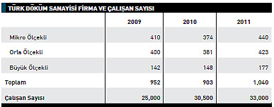 2011 yılı verilerine göre, ülkemizde 2 bin dolayında dökümhane veya döküm makinesi üreticisi bulunuyor. Faaliyet­lerinin yüzde 50’sinden fazlası metal döküm ve satışı olan işletmelerin sayısı ise bin civarındadır. Bu firmalardan sa­dece 18 tanesi kamu ve askeri kuruluş­lara aittir. Döküm sektöründeki yapı; büyük sanayi kuruluşları, KOBİ’ler ve mikro işletmeler olmak üzere üç ana grup altında toplanmıştır. 80’li yıllardan itibaren ülkemizde artan otomotiv ve sanayi yatırımlarına paralel olarak, mevcut işletmelerin kapasite­lerinde büyüme gözlendi. Yıllık 20 bin tonun üzerinde üretim kapasitesine ulaşan, özellikle demir grubu döküm­haneleri bulunan tesisler, sektörün büyük sanayi kuruluşları grubu arasın­da yer alıyor. Bu işletmelere ait çıktılar ağırlıklı olarak otomotiv, kamyon, beyaz eşya sektörlerine yöneliktir.