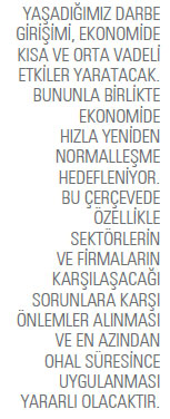 Önerileri yerine getirmek elbette çok kolay olmayacak, ancak yine de böyle bir dönemde firmalarımız önerilerimizi dikkate almalı ve uygulamalı. Bu öneriler içinde öne çıkanlar şunlar olacak: İç ve dış taahhütleri mümkün olduğunca yerine getirme, iç ve dış müşteriler ve tedarikçilerle yakın ilişki ve karşılıklı bilgilendirme, iç ve dış müşterilere kolaylıklar, harcama disiplini, ilave maliyet kontrolü, kredi ilişkilerinde güncelleme, daha yüksek kurlara karşı vadeli işlemler, gereksiz ve acil olmayan yatırımlar için öteleme, gereksiz varlık satışı ile ilave kaynak yaratılması, yatırım ortamını iyileştirme düzenlemelerinden yararlanılması. Kamu için önerimiz ise OHAL döneminin özel koşulları nedeniyle sıkıntıya girebilecek firmalar için özel bir program ve destek uygulanması gerekliliğidir. Firmalar için de ekonomik OHAL uygulamaları yapalım Hükümet, iyi niyetli olarak yeni teşvik ve iyileştirme olanakları içeren düzenlemeler açıklıyor. Ancak firmalar için şu anda öncelik yeni yatırım değil, hayatta kalabilmek. Tüm sektörlerde satışların oldukça gerilediği bir dönem yaşıyoruz. OHAL uygulanacak olan üç ay esasında firmalar için tam bir mücbir sebep oluşuyor. Bu nedenle bu dönemde oluşan koşullar nedeniyle zora girecek firmalar için de mutlaka ekonomik OHAL olanakları sunulmalı. Terör örgütüne destek olan firmalara haklı olarak müdahale edilmeli, ancak bu firmalarla çalışan tedarikçiler ve hizmet sunan kurumların (terör örgütüne destek vermedikleri kabulü ile) tüm hakları ve alacakları da korunmalı ve nakit akışı bozulmamalı. Aksi takdirde piyasalarda zincirleme ödeme zorlukları yaşanmaya başlayabilir.