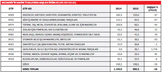 15 yılında bir önceki yıla oranla yüzde 16,3 azalarak 950,3 milyon dolar olarak kaydedildi. 2014 yılında bu rakam 1,1 milyar dolar seviyesindeydi. 2015 yılı rakamlarına göre Mozambik’in en fazla makine ithal ettiği ilk 10 ülke listesinin ilk sırasında Güney Af