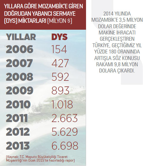2014 BM Doğrudan Yabancı Yatırım yıllık raporunda, 2013 yılında Afrika’ya yapılan doğrudan yabancı yatırım sıralamasında Mozambik, 6,7 milyar dolar ile Güney Afrika Cumhuriyeti’nden sonra Afrika’da en fazla doğrudan yabancı sermaye girişi olan ülke haline geldiği görülüyor. 2 bin 500 kilometrelik sahil şeridine sahip Mozambik’te, ayrıca büyük bir turizm potansiyeli de söz konusu. Maputo Büyükelçiliği Ticaret Müşavirliği’nin raporund
