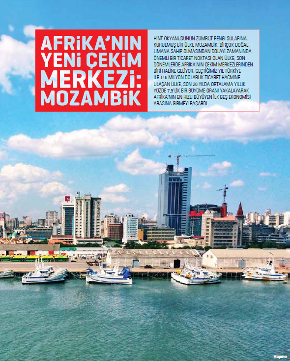 ın iyileştirilmesi ve ekonomik altyapısının yeniden inşası gayreti içerisine girmiş bir ülke konumunda bulunuyor. Son yıllarda hızla büyüme gösteren Mozambik ekonomisi son 20 yılda ortalama yüzde 7,5’lik büyüme hızını yakaladı. Hint Okyanusu’nun zümrüt rengi sularına kurulan Mozambik limanlarıyla da Zambiya, Zimbabve, Botsvana ve hatta Güney Afrika Cumhuriyeti’nin kuzey kesiminin denizle bağlantısını sağlıyor. Bu çerçeveden bakıldığında, ülkede bulunan limanlar, ekonomik bakımdan büyük önem taşıyor.