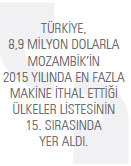 2014 yılında Türkiye’den 4 milyon dolar seviyesinde makine ithal eden Mozambik, 2015 yılında söz konusu rakamda yüzde 125,3 oranında artış yaşadı. Türkiye, 8,9 milyon dolarla Mozambik’in 2015 yılında en fazla makine ithal ettiği ülkeler listesinin 15. sırasında yer aldı.