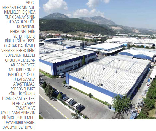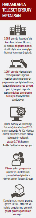Firmalarının etkinliğini artırmak ve özellikle makine ile kalıp sektöründe yapılan çalışma ve yatırımlara yoğunlaşmak amacıyla Ar-Ge merkezi kurduklarını söyleyen Teleset Group/Metalsan Ar-Ge Müdürü Soner Hanoğlu, “İstanbul’da 1986 yılında kurulan Teleset Group, ilk olarak degauss bobini üretimiyle ana sanayiye hizmet vermeye başladı. 1994 yılında Manisa’daki yerleşkesine taşınan ve yapılan yatırımlarla büyüyerek ürün yelpazesini genişleten firmamız, bugün dört ayrı grup şirketi, yurt içi ve yurt dışında toplam dokuz ayrı üretim tesisiyle faaliyetlerini sürdürüyor. 2 bine yakın çalışanıyla ulusal ve uluslararası pazardaki müşterilere hizmet veren Teleset Group; kondanser, metal parça, çevre ısıtıcı, strafor ve kablo gruplarına yönelik çeşitli proses çözümleri sunuyor” diyor. Bilim, Sanayi ve Teknoloji Bakanlığı tarafından 2016 yılının son haftasında yapılan denetimlerin ardından Ar-Ge merkezi olarak tescil edildiklerini söyleyen Hanoğlu, sektörde sahip oldukları yetkinliği Ar-Ge merkezleri sayesinde artıracaklarını vurguluyor.