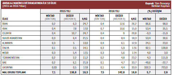 Ambalaj makineleri ürün grubunda 2016 yılının Ocak- Aralık  döneminde 142,8 milyon dolarlık ihracat gerçekleştirildi. 2015 yılının aynı döneminde bu rakam 138,8 milyon dolar seviyesindeydi. Ambalaj makineleri mal grubundaki ihracat artışı yüzde 2,9 olarak kaydedildi.