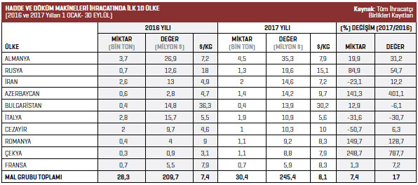 2017 yılının Ocak-Eylül döneminde Türkiye geneli hadde ve döküm makineleri sektöründe ihracat artışının en fazla yaşandığı ülke yüzde 787,7 ile Çekya oldu. Listenin ikinci sırasında yüzde 401,1 ile Azerbaycan yer alırken söz konusu ülkeyi yüzde 128,7 ihracat artışıyla Romanya üçüncü sırada izledi.