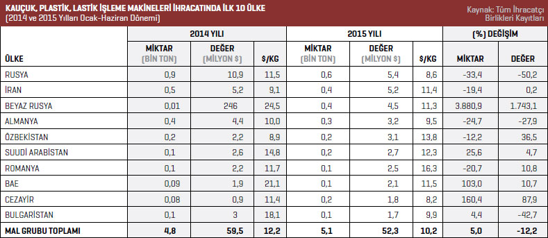 2015 yılının Ocak-Haziran döneminde Türkiye geneli kauçuk, plastik, lastik işleme makineleri aksam ve parçaları sektöründe ihracat artışının en fazla yaşandığı ülke yüzde 1.743,1 ile Beyaz Rusya oldu. Beyaz Rusya’nın ardından ikinci sırada yüzde 87,9 ile Cezayir ve üçüncü sırada ise yüzde 36,5 ihracat artışıyla Özbekistan bulunuyor.
