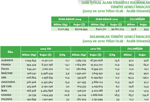 Makine ve Aksamları ihracatımızın en önemli kalemlerinden biri olan rulmanlar ihracatımız 2010 yılının Ocak-Aralık döneminde yükseliş kaydetti. Geçtiğimiz dönemin Ocak-Aralık dönemi ile karşılaştırıldığında değer bazında yüzde 35,5 yükseliş kaydetti. Değer olarak ise 2009 yılının Ocak-Aralık döneminde 67 milyon 19 bin dolar olan rulmanlar ihracatımız, 2010 yılının Ocak-Aralık döneminde ise yüzde 35,5 oranında artarak 90 milyon 812 bin dolar oldu. Rulmanlar ihracatımızın en fazla olduğu yer ise Almanya. Söz konusu yere  2010 yılının Ocak-Aralık döneminde 18 milyon 502 bin dolarlık rulmanlar ihracatı gerçekleştirildi. Bu mal grubu içerisindeki en büyük ikinci ihracat pazarımızın ise Fransa olduğu görülüyor. Fransa’ya 2009 yılının Ocak-Aralık döneminde 8 milyon 372 bin dolarlık rulmanlar ihracatımız söz konusu iken 2010 yılının aynı dönemine gelindiğinde 15 milyon 324 bin dolar ihracat düzeyi yakalandı. Rulmanlar ihracatımızın üçüncü en büyük pazarı ise İtalya oldu. İtalya’ya 2009 yılının Ocak-Aralık döneminde 7 milyon 162 bin dolarlık rulmanlar ihracatımız söz konusu iken 2010 yılının aynı dönemine gelindiğinde