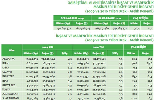 Makine ve Aksamları ihracatımızın en önemli kalemlerinden biri olan inşaat ve madencilik makineleri ihracatımız 2010 yılının Ocak-Aralık döneminde yükseliş kaydetti. Geçtiğimiz dönemin Ocak-Aralık dönemi ile karşılaştırıldığında değer bazında yüzde 22,1 yükseliş kaydetti. Değer olarak ise 2009 yılının Ocak-Aralık döneminde 607 milyon 576 bin dolar olan inşaat ve madencilik makineleri ihracatımız, 2010 yılının Ocak-Aralık döneminde ise yüzde 22,1 oranında artarak 741 milyon 784 bin dolar oldu.
