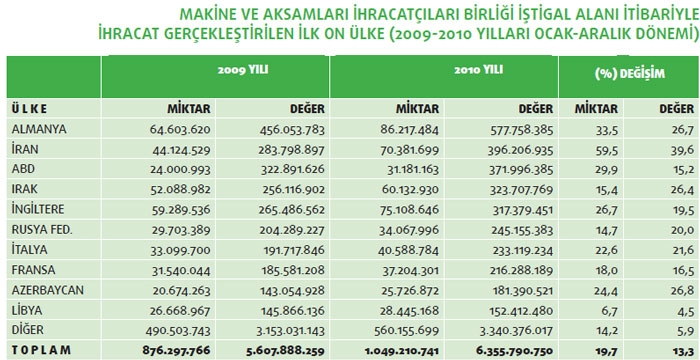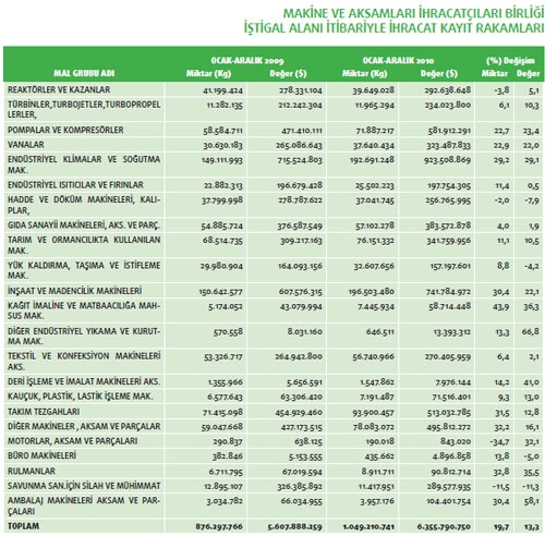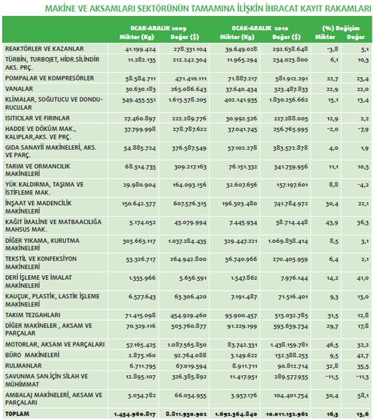 Makine sektörü toplamı 84’üncü faslın tamamı ve 84’üncü fasıl dışı Makine ve Aksamları İhracatçıları Birliği iştigal alanı itibariyle makine sektörünün tamamının ihracatı 2009 yılı Ocak-Aralık döneminde 8 milyar 811 milyon 930 bin dolar olarak belirlendi. 2010 yılı içerisinde bu rakam aynı dönemde yüzde 13,6 oranında artış gösterdi ve 10 milyar 11 milyon 152 bin dolara yükseldi.