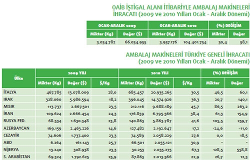 Makine ve Aksamları ihracatımızın en önemli kalemlerinden biri olan ambalaj makineleri ihracatımız 2010 yılının Ocak-Aralık döneminde artış kaydetti. Geçtiğimiz dönemin Ocak-Aralık dönemi ile karşılaştırıldığında değer bazında yüzde 58,1 yükseldi. Değer olarak ise 2009 yılının Ocak-Aralık döneminde 66 milyon 34 bin dolar olan ambalaj makineleri ihracatımız, 2010 yılının Ocak-Aralık döneminde ise yüzde 58,1 oranında artarak 104 milyon 401 bin dolar oldu.