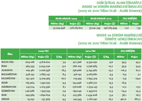 Makine ve Aksamları ihracatımızın en önemli kalemlerinden biri olan hadde ve döküm makineleri ihracatımız 2010 yılının Ocak-Aralık döneminde düşüş gösterdi. Geçtiğimiz dönemin Ocak-Aralık dönemi ile karşılaştırıldığında değer bazında yüzde 7,9 azaldı. Değer olarak ise 2009 yılının Ocak-Aralık döneminde 278 milyon 787 bin dolar olan hadde ve döküm makineleri ihracatımız, 2010 yılının Ocak-Aralık döneminde ise yüzde 7,9 oranında azalarak 259 milyon 765 bin dolar oldu.