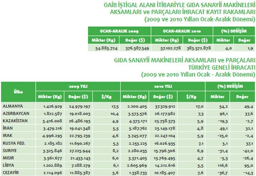 Makine ve Aksamları ihracatımızın en önemli kalemlerinden biri olan gıda sanayii makineleri aksamları ve parçaları ihracatımız 2010 yılının Ocak-Aralık döneminde yükseliş gösterdi. Geçtiğimiz dönemin Ocak-Aralık dönemi ile karşılaştırıldığında değer bazında yüzde 1,9 yükseliş kaydetti. Değer olarak ise 2009 yılının Ocak-Aralık döneminde 376 milyon 587 bin dolar olan gıda sanayii makineleri aksamları ve parçaları ihracatımız, 2010 yılının Ocak-Aralık döneminde ise yüzde 1,9 oranında artarak 383 milyon 572 bin dolar oldu.