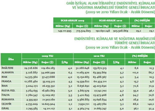 Makine ve Aksamları ihracatımızın en önemli kalemlerinden biri olan endüstriyel klimalar ve soğutma makineleri ihracatımız 2010 yılının Ocak-Aralık döneminde yükseliş gösterdi. Geçtiğimiz dönemin Ocak-Aralık dönemi ile karşılaştırıldığında değer bazında yüzde 29,1 yükseliş kaydetti. Değer olarak ise 2009 yılının Ocak-Aralık döneminde 715 milyon 524 bin dolar olan endüstriyel klimalar ve soğutma makineleri ihracatımız, 2010 yılının Ocak-Aralık döneminde ise yüzde 29,1 oranında artarak 923 milyon 508 bin dolar oldu. Endüstriyel klimalar ve soğutma makineleri ihracatımızın en fazla olduğu yer ise İngiltere. Söz konusu yere 2010 yılının Ocak-Aralık döneminde 133 milyon 872 bin dolarlık endüstriyel klimalar ve soğutma makineleri ihracatı gerçekleştirildi. Bu mal grubu içerisindeki en büyük ikinci ihracat pazarımızın ise Almanya olduğu görülüyor. Almanya’ya 2009 yılının Ocak-Aralık döneminde 34 milyon 66 bin dolarlık endüstriyel klimalar ve soğutma makineleri ihracatımız söz konusu iken 2010 yılının aynı dönemine gelindiğinde 63 milyon 593 bin dolar ihracat düzeyi yakalandı. Endüstriyel klimalar ve soğutma makineleri ihracatımızın üçüncü en büyük pazarı ise Irak oldu. Irak’a 2009 yılının Ocak-Aralık döneminde 57 milyon 477 bin dolarlık endüstriyel klimalar ve soğutma makineleri ihracatımız söz konusu iken 2010 yılının aynı dönemine gelindiğinde 63 milyon 488 bin dolara yükseldi. Endüstriyel klimalar ve soğutma makineleri ihracatımızda dördüncü sırada Fransa yer alıyor. Fransa’ya 2009 yılının Ocak-Aralık döneminde 55 milyon 25 bin dolarlık endüstriyel klimalar ve soğutma makineleri ihracatımız söz konusu iken 2010 yılının aynı dönemine gelindiğinde 60 milyon 434 bin dolar ihracat gerçekleşti. Endüstriyel klimalar ve soğutma makineleri ihracatımızın 2010 yılı Ocak-Aralık döneminde en fazla artış gösterdiği ilk beşte yer alan beşinci ülkenin ise İran olduğu açıklandı. İran’a 2009 yılının Ocak-Aralık döneminde 26 milyon 35 bin dolarlık ihracatımız söz konusu iken 2010 yılının aynı dönemine gelindiğinde ise 45 milyon 23 bin dolar ihracat gerçekleşti. Endüstriyel klimalar ve soğutma makineleri ihracatımızda değer bakımından ise ilk üç sırada yüzde 86,7 değer artışı ile Almanya yer alıyor. Söz konusu ülkeden sonra yüzde 72,9 ile İran ve sonrasında yüzde 70,8 oranında yükselişle İtalya takip ediyor.