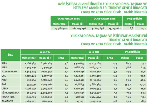 Makine ve Aksamları ihracatımızın en önemli kalemlerinden biri olan yük kaldırma, taşıma ve istifleme makineleri ihracatımız 2010 yılının Ocak-Aralık döneminde gerileme kaydetti. Geçtiğimiz dönemin Ocak-Aralık dönemi ile karşılaştırıldığında değer bazında yüzde 4,2 düşüş kaydetti. Değer olarak ise 2009 yılının Ocak-Aralık döneminde 164 milyon 93 bin dolar olan yük kaldırma, taşıma ve istifleme makineleri ihracatımız, 2010 yılının Ocak-Aralık döneminde ise yüzde 4,2 oranında azalarak 923 milyon 508 bin dolar oldu.  Yük kaldırma, taşıma ve istifleme makineleri ihracatımızın en fazla olduğu yer ise İran. Söz konusu yere 2010 yılının Ocak-Aralık döneminde 14 milyon 413 bin dolarlık yük kaldırma, taşıma ve istifleme makineleri ihracatı gerçekleştirildi. Bu mal grubu içerisindeki en büyük ikinci ihracat pazarımızın ise Irak olduğu görülüyor. Irak’a 2009 yılının Ocak-Aralık döneminde 7 milyon 319 bin dolarlık yük kaldırma, taşıma ve istifleme makineleri ihracatımız söz konusu iken 2010 yılının aynı dönemine gelindiğinde 11 milyon 987 bin dolar ihracat düzeyi yakalandı. Yük kaldırma, taşıma ve istifleme makineleri ihracatımızın üçüncü en büyük pazarı ise Azerbaycan oldu. Azerbaycan’a 2009 yılının Ocak-Aralık döneminde 7 milyon 502 bin dolarlık yük kaldırma, taşıma ve istifleme makineleri ihracatımız söz konusu iken 2010 yılının aynı dönemine gelindiğinde 9 milyon 216 bin dolara yükseldi. Yük kaldırma, taşıma ve istifleme makineleri ihracatımızda dördüncü sırada ÇHC yer alıyor. ÇHC’ne 2009 yılının Ocak-Aralık döneminde 9 milyon 567 bin dolarlık yük kaldırma, taşıma ve istifleme makineleri ihracatımız söz konusu iken 2010 yılının aynı dönemine gelindiğinde 8 milyon 550 bin dolar ihracat gerçekleşti. Yük kaldırma, taşıma ve istifleme makineleri ihracatımızın 2010 yılı Ocak-Aralık döneminde en fazla artış gösterdiği ilk beşte yer alan beşinci ülkenin ise ABD olduğu açıklandı. ABD’ne 2009 yılının Ocak-Aralık döneminde 5 milyon 582 bin dolarlık ihracatımız söz konusu iken 2010 yılının aynı dönemine gelindiğinde ise 8 milyon 153 bin dolar ihracat gerçekleşti.