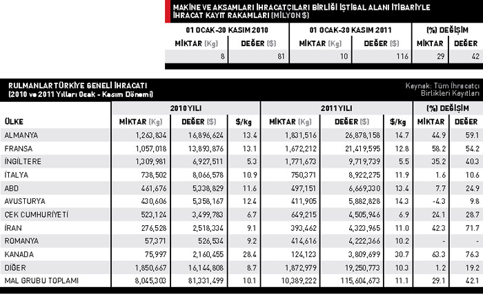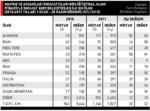 Makine ve Aksamları İhracatçıları Birliği iştigal alanına giren GTİP’ler kapsamında belirlenen Türkiye geneli ihracat kayıtlarına göre sektör ihracatımızda ise yüzde 33 oranında artış yaşandı. 2010 yılı Ocak-Kasım döneminde 6 milyar dolar olan ihracat kayıt rakamı; 2011 yılı aynı döneminde 8 milyar dolar oldu.