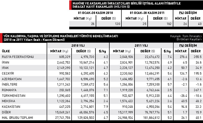 Makine ve aksamaları ihracatımızın en önemli kalemlerinden biri olan yük kaldırma, taşıma ve istifleme makineleri ihracatımız 2011 yılının Kasım döneminde artış kaydetti. 2010 yılının aynı dönemi ile karşılaştırıldığında yüzde 40 oranında artış gösteren yük kaldırma, taşıma ve istifleme makineleri ihracatımız 182 milyon dolar oldu.