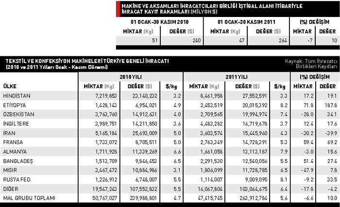 Makine ve Aksamaları İhracatçıları Birliği iştigal alanı itibariyle ihracat kayıt rakamlarına bakıldığında 2010 yılı Ocak- Kasım döneminde 240 milyon dolarken yüzde 10 oranında değer kazanan tekstil ve konfeksiyon makineleri ihracatı 2011 yılının aynı döneminde 264 milyon dolar seviyesine yükseldi.