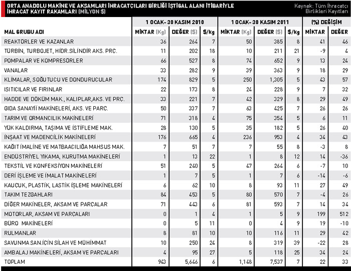 Makine sektörü toplamı (84’üncü faslın tamamı ve 84’üncü fasıl dışı Makine ve Aksamları İhracatçıları Birliği iştigal alanı toplamından oluşan makine sektörünün tamamının) ihracatı 2010 yılı Ocak-Kasım döneminde 8 milyar dolarken bu rakam 2011 yılı aynı döneminde yüzde 23 oranında artarak 10 milyar doları aştı.