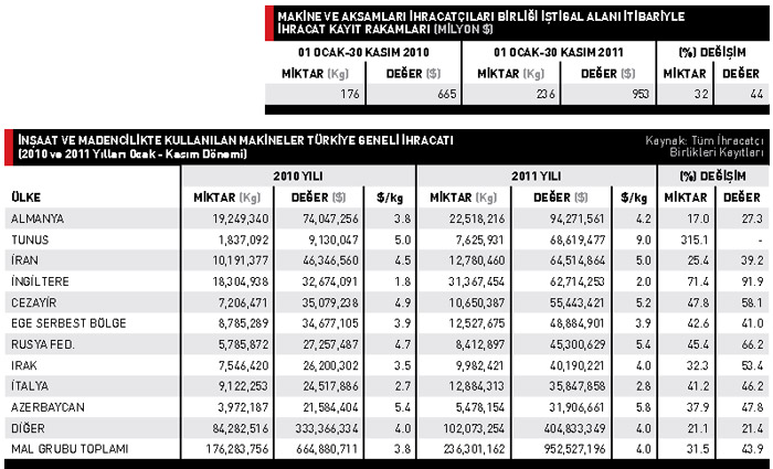 İnşaat ve madencilikte kullanılan makineler ihracatımızda yüzde 27 oranında artış yaşayan Almanya birinci sırada yer aldı. Anılan ülkeye olan ihracatımız 2010 yılında 74 milyon dolarken 2011 yılının Ocak-Kasım döneminde 94 milyon dolar oldu. Sıralama ikinci sırada ise Tunus var. Tunus’a gerçekleştirdiğimiz inşaat ve madencilikte kullanılan makineler ihracatımızda rekor düzeyde artış