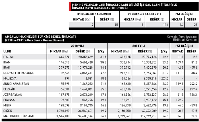 Değer olarak 2010 yılının Kasım döneminde 95 milyon dolar olan ambalaj makineleri ihracatımız, 2011 yılının Kasım döneminde ise 118 milyon dolar oldu. Ambalaj makineleri ihracatımızın en fazla olduğu yer ise İtalya. Söz konusu ülkeye 2011 yılının Kasım döneminde 21 milyon dolarlık ambalaj makineleri ihracatı gerçekleştirildi. Bu mal grubu içerisindeki en büyük ikinci ihracat pazarımızın ise İran olduğu tespit edildi. İran’a 2010 yılının Kasım döneminde 6 milyon dolarlık ambalaj makineleri ihracatımız