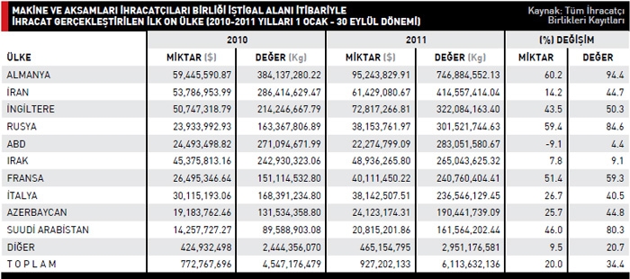2011 yılı Ocak-Eylül dönemi iştigal alanı itibariyle ihracat gerçekleştirilen ülkeler arasında değer bazında ise 94,4 oranında artışla Almanya birinci olurken; sırasıyla 84,6 oranında yükselişle Rusya ve sonrasında yüzde 80,3 oranında artışla Suudi Arabistan takip etti.