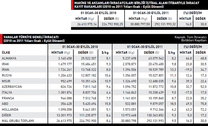 Makine ve Aksamları İhracatçıları Birliği iştigal alanı itibariyle vanalar ihracatı 2010 yılı Ocak Eylül döneminde 224 milyon 792 bin dolar seviyelerini yakaladı. Aynı dönemin 2011 yılı ile kıyaslandığında vanalar ihracatımızın yüzde 30 oranında değer kazanarak 292 milyon 131 bin dolar seviyesine yükseldiği görüldü.