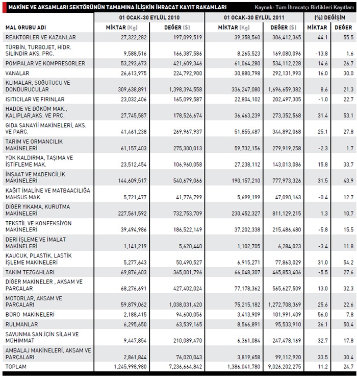 Makine sektörü toplamı 84’üncü faslın tamamı ve 84’üncü fasıl dışı Makine veAksamları İhracatçıları Birliği iştigal alanı toplamından oluşan makine sektörünün tamamının ihracatı 2010 yılı Ocak Eylül döneminde 7 milyar 236 milyar 664 bin dolarken bu rakam 2011 yılı aynı döneminde yüzde 24,7 oranında artarak 9 milyar 26 milyon 202 bin dolara yükseldi.