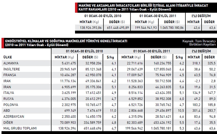 Değer olarak 2010 yılının Eylül döneminde 651 milyon 448 bin dolar olan endüstriyel klimalar ve soğutma makineleri ihracatımız, 2011 yılının Eylül döneminde ise 1 milyar 65 milyon 780 bin dolar oldu. Endüstriyel klimalar ve soğutma makineleri ihracatımızın en fazla olduğu yer ise Almanya.