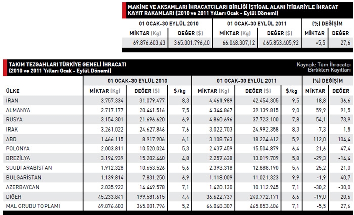 Türkiye genel ihracatında takım tezgahlarında değer bazında yüzde 27,6 oranında artış yaşandı. Takım tezgahları ihracatımızda 2011 yılının Ocak-Eylül döneminde ise en fazla yüzde 36,6 değer artışıyla İran’a gerçekleştirilen ihracatımız ülkeler genelinde ilk sıraya oturdu. 2011 yılı Ocak-Eylül döneminde 42 milyon 454 bin dolar ihracat gerçekleştirilen söz konusu ülkeye,geçtiğimiz senenin aynı döneminde ise 31 milyon 79 bin dolarlık ihracat gerçekleşmişti.