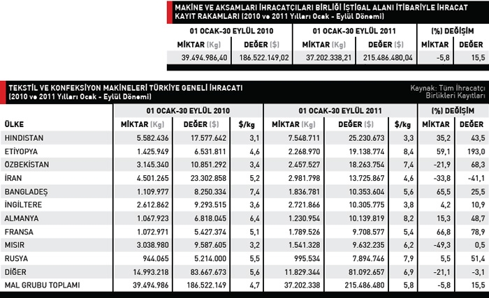 2010 yılı Ocak-Eylül döneminde 186milyon 522 bin dolar olarak gerçekleşentekstil ve konfeksiyon makineleriihracatımız, 2011 yılının aynı döneminegelindiğinde yüzde 15,5 oranında artışgöstererek 215 milyon 486 seviyesineyükseldi.