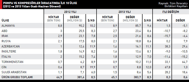 Pompa ve kompresörler ürün grubunda 2013 yılının Ocak-haziran döneminde 383,7 milyon dolar değerinde ihracat gerçekleştirildi. Bir önce yıla göre ihracat artışının yüzde 0,6 olarak kaydedildiği sektörün 2012 yılı ihracat rakamı 381,4 milyon dolardı. Pompa ve kompresörler kaleminde, 2013 yılının Ocak-Haziran döneminde en fazla ihracat gerçekleştirilen ülke 85,7 milyon dolarla Almanya oldu. Listenin ikinci sırasında bulunan ABD’ye 2013 yılının Ocak-Haziran döneminde 23,4 milyon dolarlık ihracat gerçekleştirildi. Üçüncü sıradaki Irak’a 2013 yılının Ocak-Haziran döneminde ihraç edilen ürünlerin değeri 21,6 milyon dolar olarak kaydedildi. Dördüncü sıradaki Rusya’ya 2012 yılının Ocak-Haziran döneminde pompa ve kompresörler kaleminde ihraç edilen ürünlerin değeri 17,5 milyon dolardan, yüzde 7,9 artışla 2013 yılı - nın aynı döneminde 18,8 milyon dolar rakamına yükseldi. Beşinci sırada yer alan Azerbaycan’a 2013 yılının Ocak- Haziran döneminde yüzde 29,4 artışla 16,1 milyon dolar değerinde ürün ihraç edildi. 2012 yılının aynı döneminde söz konusu ülkeye gönderilen pompa ve kompresörlerin değeri 12,4 milyon dolardı. Türkiye geneli pompa ve kompresörler ihracatı tablosunda en fazla artış yüzde 64,7 ile Türkmenistan’da yaşandı. İkinci sırada yüzde 29,4 ile Azerbaycan’ın yer aldığı tablonun üçüncü sırasında ise yüzde 18,4 ile Suudi Arabistan bulunuyor.