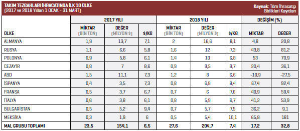 Takım tezgâhları ürün grubunda en fazla ihracat gerçekleştirilen Almanya’ya 2018 yılının Ocak-Mart döneminde 16,6 milyon dolarlık ürün gönderildi. 2017 yılının aynı döneminde bu rakam 13,7 milyon dolar seviyesindeydi. Almanya’ya yönelik ihracat yüzde 20,8 arttı. İkinci sırada yer alan Rusya’ya 2017 yılının Ocak- Mart döneminde ihraç edilen ürünlerin değeri 6,6 milyon dolarken, 2018 yılının aynı döneminde bu rakam yüzde 81,2 artışla 12 milyon dolar olarak kaydedildi. Listenin üçüncü sırasında bulunan Polonya’ya 2017 yılının Ocak-Mart döneminde 5,8 milyon dolarlık ihracat gerçekleştirilirken, 2018 yılının aynı döneminde bu rakam yüzde 70,9 artışla 10 milyon dolar olarak kayda geçti. Listenin dördüncü sırasındaki Cezayir’e 2018 yılının Ocak-Mart döneminde 9,5 milyon dolar değerinde ürün ihraç edildi. 2017 yılının aynı döneminde bu rakam 7 milyon dolardı. Cezayir’e yönelik ihracat yüzde 36,1 arttı. Listenin beşinci sırasında bulunan ABD’ye 2018 yılının Ocak-Mart döneminde 8 milyon dolarlık takım tezgâhı ihraç edildi.