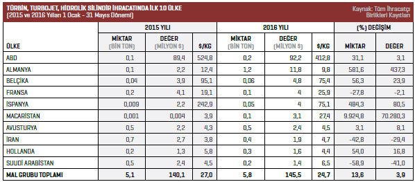 Türbin, turbojet, hidrolik silindir aksam ve parçaları ihracatı 2016 yılının Ocak-Mayıs döneminde 145,5 milyon dolar olarak kaydedildi. 2015 yılının aynı döneminde bu rakam 140,1 milyon dolar seviyesindeydi.