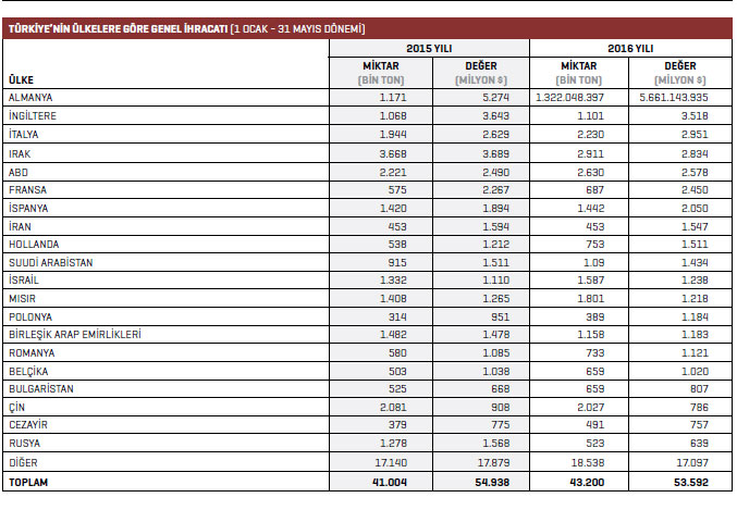 Türbin, turbojet, hidrolik silindir aksam ve parçaları ihracatı 2016 yılının Ocak-Mayıs döneminde 145,5 milyon dolar olarak kaydedildi. 2015 yılının aynı döneminde bu rakam 140,1 milyon dolar seviyesindeydi. Türbin, turbojet, hidrolik silindir aksam ve parçaları ürün grubundaki ihracat artışı yüzde 3,9 oldu. Türbin, turbojet, hidrolik silindir aksam ve parçaları kaleminde 2016 yılının Ocak- Mayıs döneminde en fazla ihracat gerçekleştirilen ülke 92,2 milyon dolarla ABD oldu. 2015 yılının aynı döneminde bu rakam 89,4 milyon dolardı. ABD’ye yönelik ihracat artışı yüzde 3,1 oldu. ABD’nin ardından ikinci sırada bulunan Almanya’ya yönelik türbin, turbojet, hidrolik silindir aksam ve parçaları ihracatı 2016 yılının Ocak-Mayıs döneminde 11,8 milyon dolar oldu. Yüzde 437,3 ihracat artışının yaşandığı söz konusu ülkeye, 2015 yılının aynı döneminde gönderilen ürünlerin değeri 2,2 milyon dolardı. Listenin üçüncü sırasında yer alan Belçika’ya 2016 yılının Ocak- Mayıs döneminde 4,8 milyon dolarlık ürün ihraç edildi. 2015 yılının aynı döneminde bu rakam 3,9 milyon dolardı. Belçika’ya yönelik ihracat artışı yüzde 23,9 oldu. Dördüncü sırada bulunan Fransa’ya 2016 yılının Ocak- Mayıs döneminde 4 milyon dolar değerinde ihracat gerçekleştirildi. Beşinci sıradaki İspanya’ya 2015 yılının Ocak- Mayıs döneminde 2,2 milyon dolar değerinde türbin, turbojet, hidrolik silindir aksam ve parçaları ihraç edilirken 2016 yılının aynı döneminde bu rakam yüzde 80,5 artışla 4 milyon dolar oldu. 2016 yılının Ocak-Mayıs döneminde Türkiye geneli türbin, turbojet, hidrolik silindir aksam ve parçaları sektöründe en fazla ihracat artışı yüzde 70.280,3 ile Macaristan’da gerçekleşti. Listede Almanya yüzde 437,3 ile ikinci, İspanya ise yüzde 80,5 ile üçüncü sırada yer aldı.