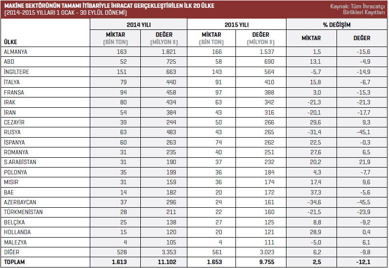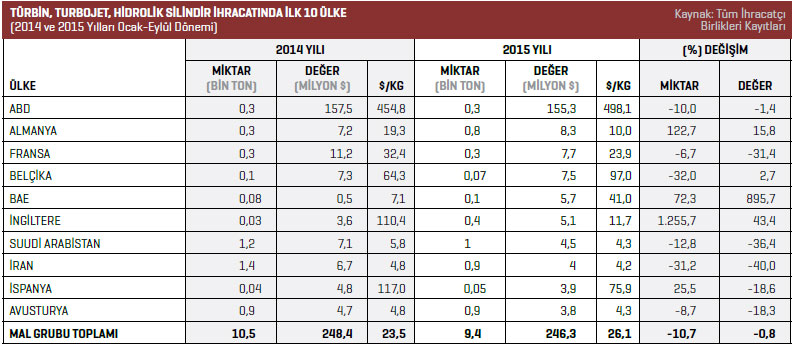 2015 yılının Ocak-Eylül döneminde Türkiye geneli türbin, turbojet, hidrolik silindir aksam ve parçaları sektöründe en fazla ihracat artışı yüzde 895,7 ile Birleşik Arap Emirlikleri’nde gerçekleşti. Listede İngiltere yüzde 43,4 ile ikinci, Almanya ise yüzde 15,8 ile üçüncü sırada yer aldı.