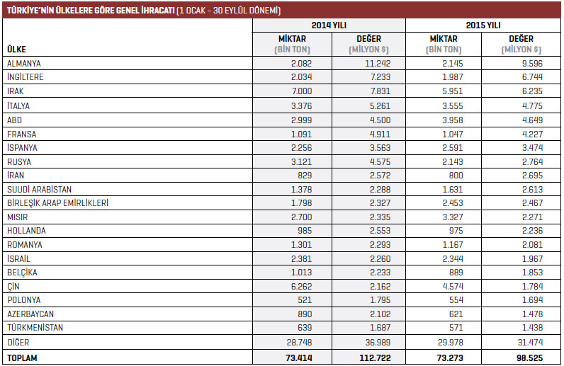 Türbin, turbojet, hidrolik silindir aksam ve parçaları kaleminde 2015 yılının Ocak-Eylül döneminde en fazla ihracat gerçekleştirilen ülke 155,3 milyon dolarla ABD oldu. ABD’nin ardından ikinci sırada bulunan Almanya’ya yönelik türbin, turbojet, hidrolik silindir aksam ve parçaları ihracatı 2015 yılının Ocak- Eylül döneminde 8,3 milyon dolar oldu. Yüzde 15,8 ihracat artışının yaşandığı söz konusu ülkeye, 2014 yılının aynı döneminde gönderilen ürünlerin değeri 7,2 milyon dolardı. Listenin üçüncü sırasında yer alan Fransa’ya 2015 yılının Ocak-Eylül döneminde 7,7 milyon dolarlık ürün ihraç edildi. Beşinci sıradaki Birleşik Arap Emirlikleri’ne 2014 yılının Ocak-Eylül döneminde 578 bin dolar değerinde türbin, turbojet, hidrolik silindir aksam ve parçaları ihraç edilirken 2015 yılının aynı döneminde bu rakam yüzde 895,7 artışla 5,7 milyon dolar oldu. Dördüncü sırada bulunan Belçika’ya 2014 yılının Ocak-Eylül döneminde 7,3 milyon dolar değerinde ihracat gerçekleştirilirken 2015 yılının aynı döneminde bu rakam yüzde 2,7 artışla 7,5 milyon dolar seviyesine yükseldi.