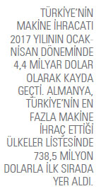 2017 yılının Ocak-Nisan döneminde Türkiye’nin makine ihracatı 4,4 milyar dolara yükseldi. Türkiye’nin en fazla ihracat gerçekleştirdiği ilk 20 ülke listesinde 2017 yılı Ocak-Nisan dönemi itibarıyla Almanya 738,5 milyon dolarla ilk sırada yer alıyor. 2016 yılının aynı döneminde Almanya’ya gönderilen ürünlerin değeri 733,8 milyon dolar seviyesindeydi. Söz konusu ülkeye yönelik ihracat artışı yüzde 0,6 oldu. Listenin ikinci sırasındaki ABD’ye yönelik makine ihracatı, 2017 yılı Ocak-Nisan döneminde 318 milyon dolar olarak kaydedildi. Türkiye’nin en fazla makine ihracatı gerçekleştirdiği ilk 20 ülke listesinin üçüncü sırasında ise İtalya bulunuyor. İtalya’ya 2016 yılının Ocak-Nisan döneminde 206,4 milyon dolarlık ihracat gerçekleştirilirken 2017 yılının aynı döneminde bu rakam yüzde 7,8 artışla 222,4 milyon dolar seviyesine yükseldi.
