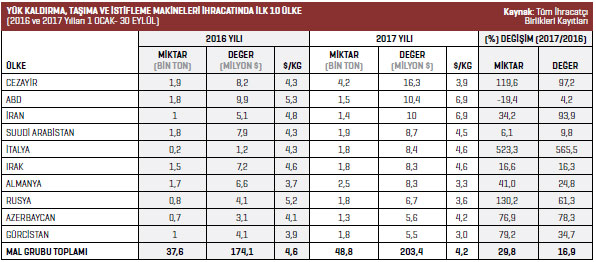 Yük kaldırma, taşıma ve istifleme makineleri ürün grubunda 2017 yılının Ocak-Eylül döneminde 16,3 milyon dolarla en fazla Cezayir’e ihracat gerçekleştirildi. 2016 yılının aynı döneminde bu rakam 8,2 milyon dolardı. Cezayir’e yönelik ihracat artışı yüzde 97,2 oldu.