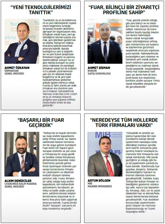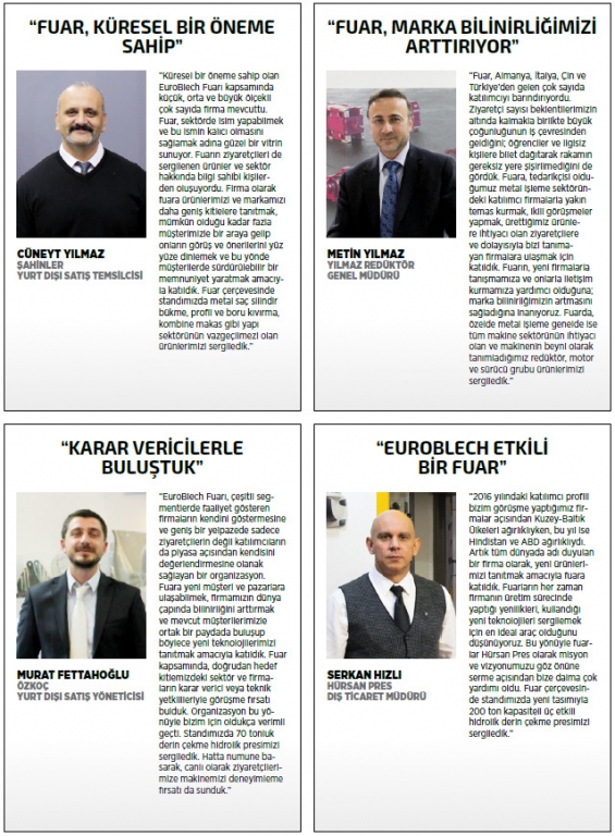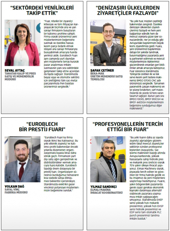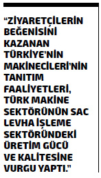 Almanya’nın Hannover şehrinde 27-30 Ekim tarihlerinde düzenlenen 25. Uluslararası Sac Levha İşleme Teknolojisi Fuarı EuroBlech’e katılan Türkiye’nin Makinecileri, 56 bin 301 kişinin ziyaret ettiği organizasyon kapsamında fuar katılımcıları ve ziyaretçilerine Türk makine sektörünün faaliyetleri hakkında ayrıntılı bilgi sundu. İki yılda bir düzenlenen EuroBlech Fuarı’na bu yıl 40 ülkeden 1507 firma katıldı. Ziyaretçilerin beğenisini kazanan Türkiye’nin Makinecileri’nin tanıtım faaliyetleri, Türk makine sektörünün sac levha işleme sektöründeki üretim gücü ve kalitesine vurgu yaparken, bu yılki fuara Türkiye’den 97 firma katıldı.