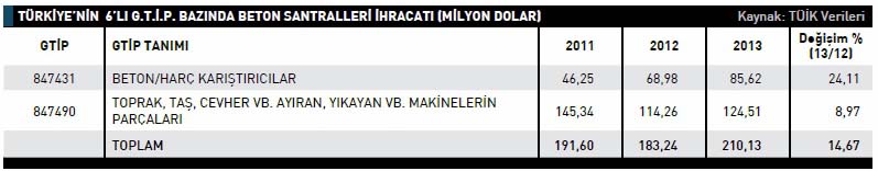 Son yıllarda Türk inşaat sektörünün global ölçekte konumunu güçlendirmesi beton santrali üretimini olumlu yönde etkiledi. Beton santralleri ihracatı 2013 yılında yüzde 14,6’lık artışla 210 milyon dolara yükseldi.